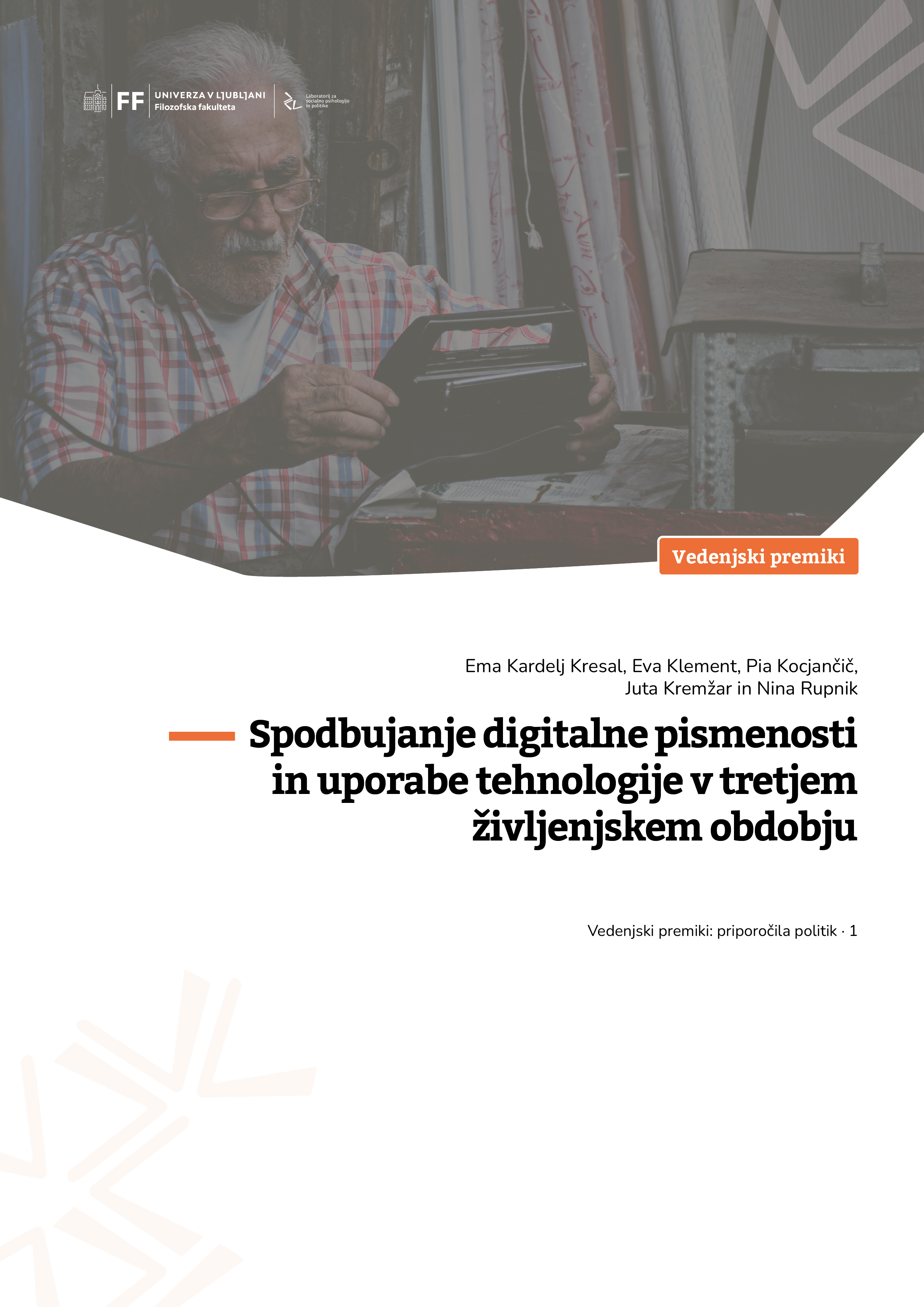 Kardelj Kresal, E., Klement, E., Kocjančič, P., Kremžar, J. in Rupnik, N. (2025). Spodbujanje digitalne pismenosti in uporabe tehnologije v tretjem življenjskem obdobju [priporočila politik]. Založba Univerze v Ljubljani. https://doi.org/10.4312/9789612976132